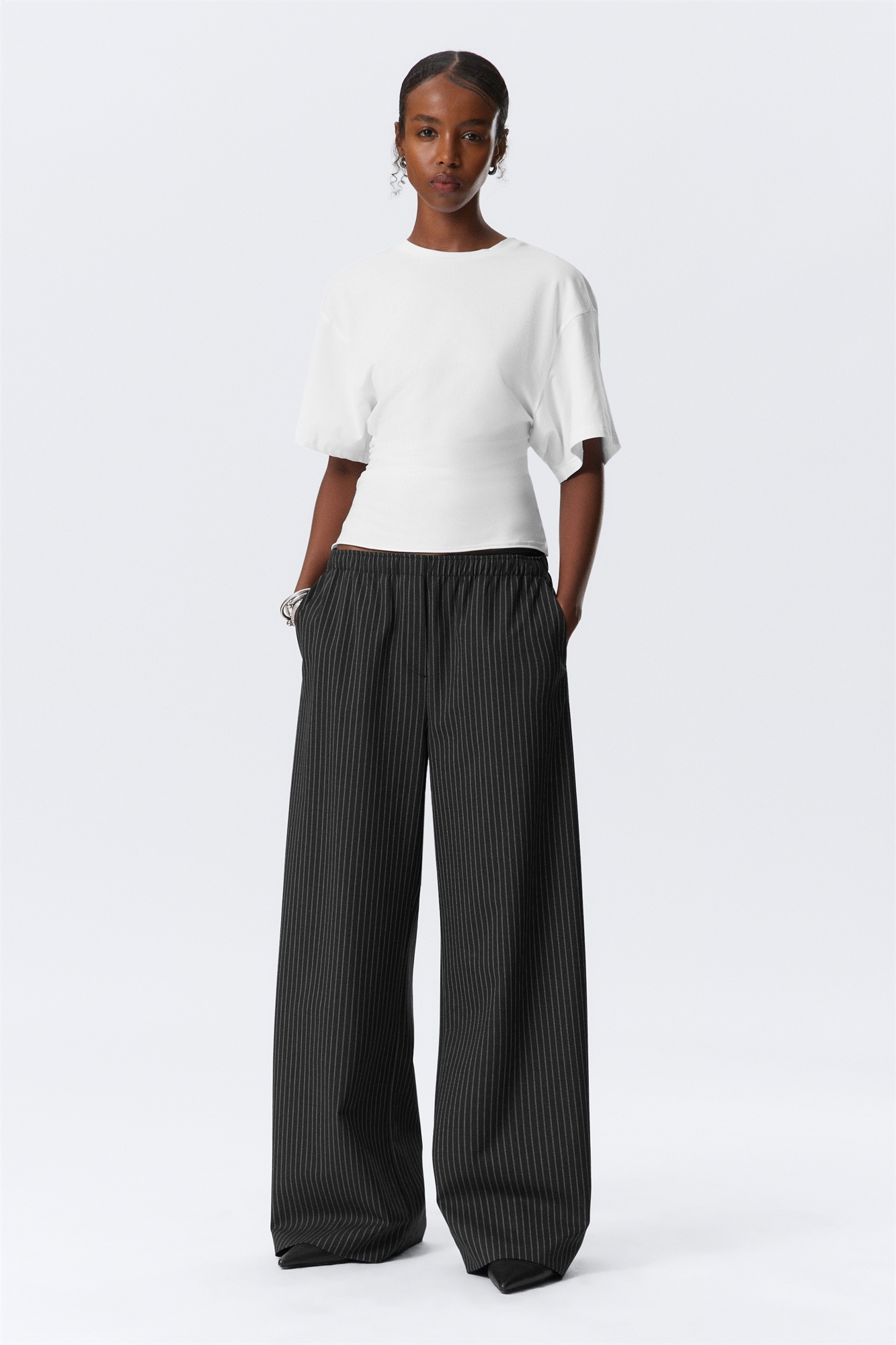 Костюмные брюки свободного покроя с низкой посадкой. Изготовленные из хлопка, они имеют широкие штанины, эластичный пояс со скрытыми завязками и чисто обработанные подолы. Застежка-шлевка, косые боковые карманы и задние карманы.
