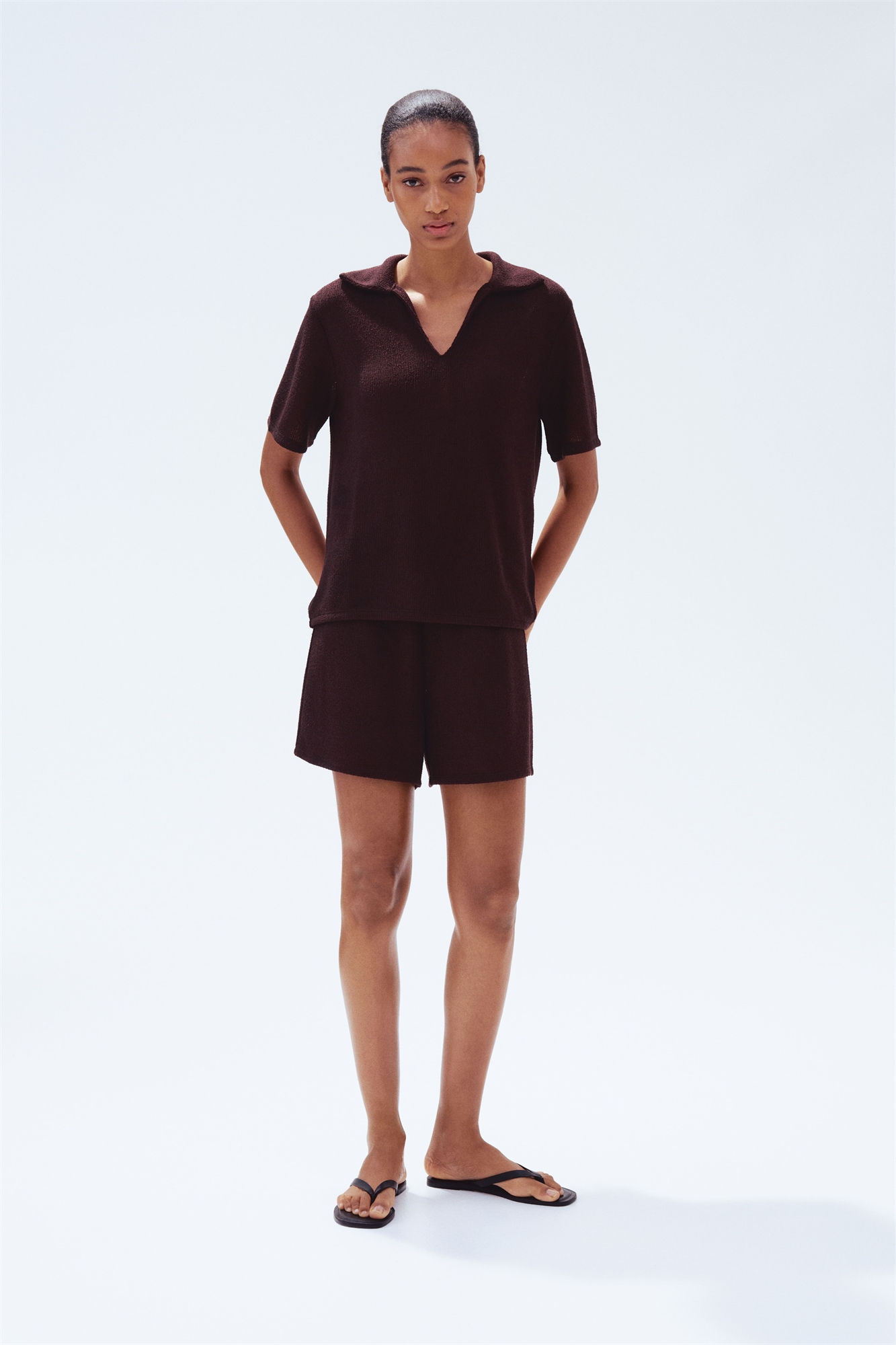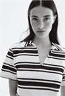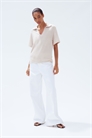 Трикотажный топ свободного покроя с открытым воротником, слегка спущенными плечами и короткими рукавами.