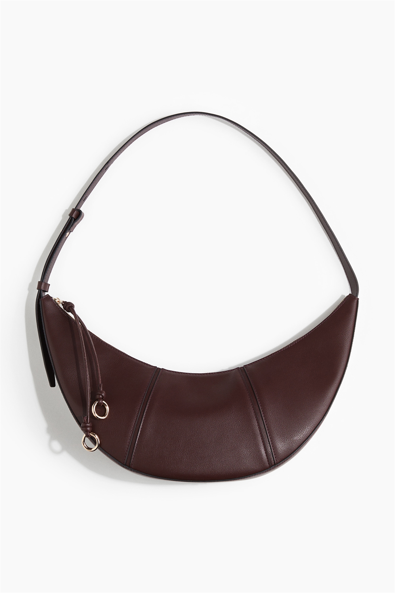 Изогнутая сумка с видимыми швами и застежкой-молнией в верхней части с длинными узловатыми шнурками, украшенными блестящими металлическими кольцами. Регулируемый плечевой ремень. На подкладке.