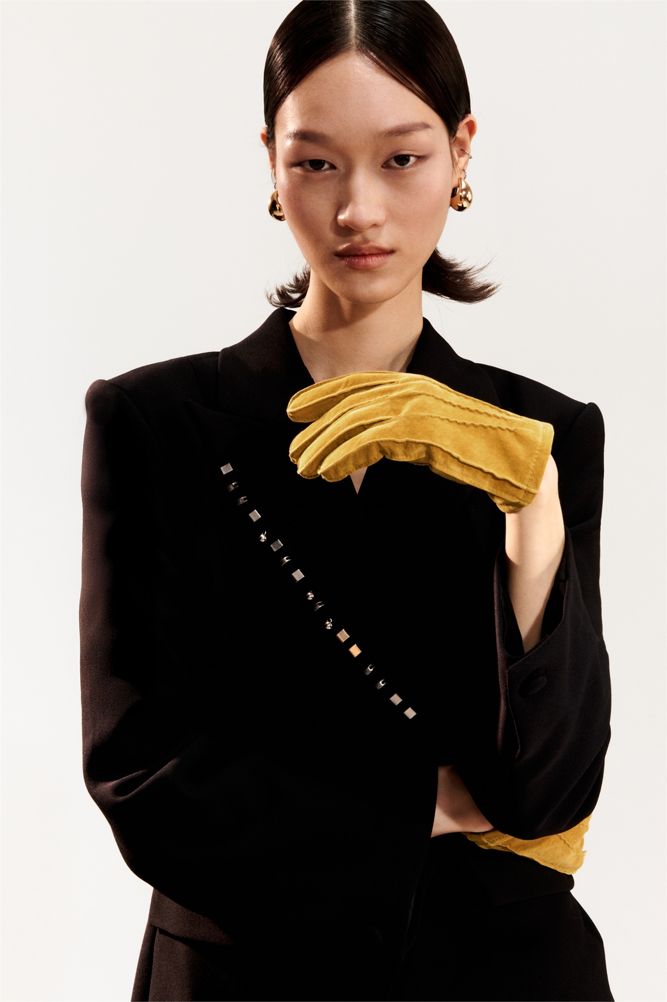Перчатки из мягкой замши с декоративной строчкой на верхней части. На подкладке.
