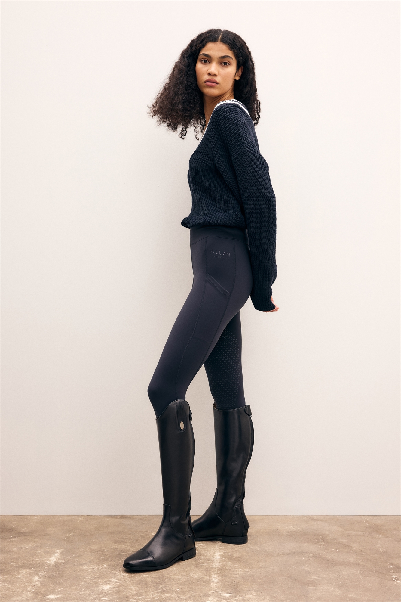 Леггинсы для верховой езды из быстросохнущего, дышащего трикотажа с четырехсторонней растяжкой для комфорта и полной свободы движений. С высокой талией, широким поясом и боковыми карманами, достаточно вместительными для мобильного телефона. Силиконовый наколенник для надежной фиксации в седле.