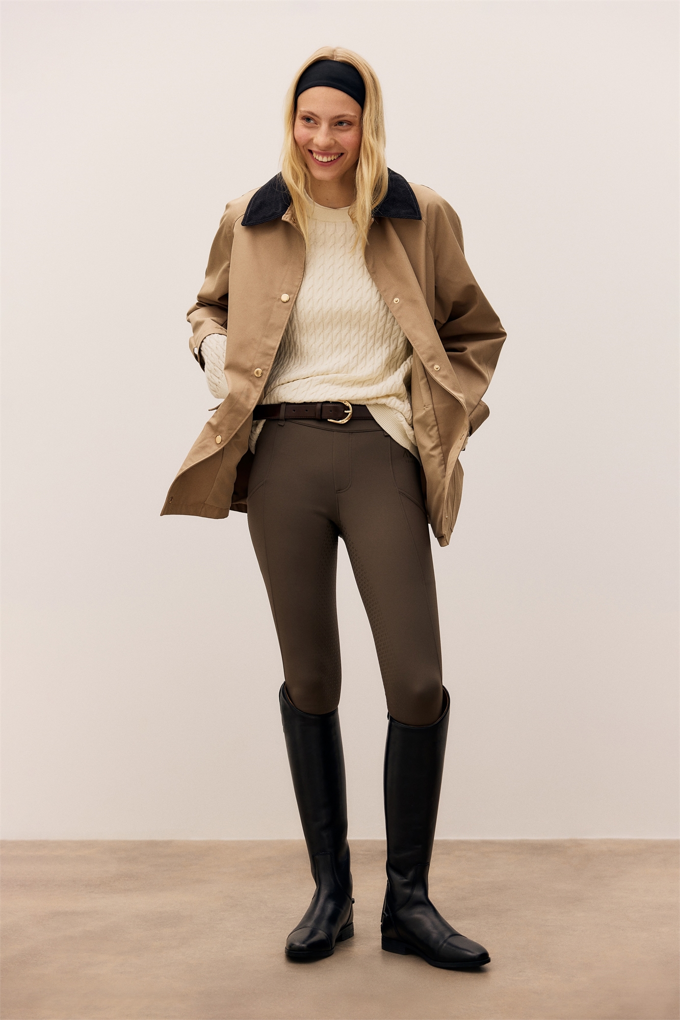 Леггинсы для верховой езды из функциональной ткани с четырехсторонней растяжкой для дополнительного комфорта и свободы движений. Высокая талия с широким поясом, фальшивая ширинка, боковые карманы с местом для мобильного телефона и фальшивые накладные карманы сзади с декоративной пуговицей. Снабжены силиконовым захватом для надежной фиксации в седле.