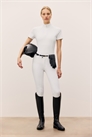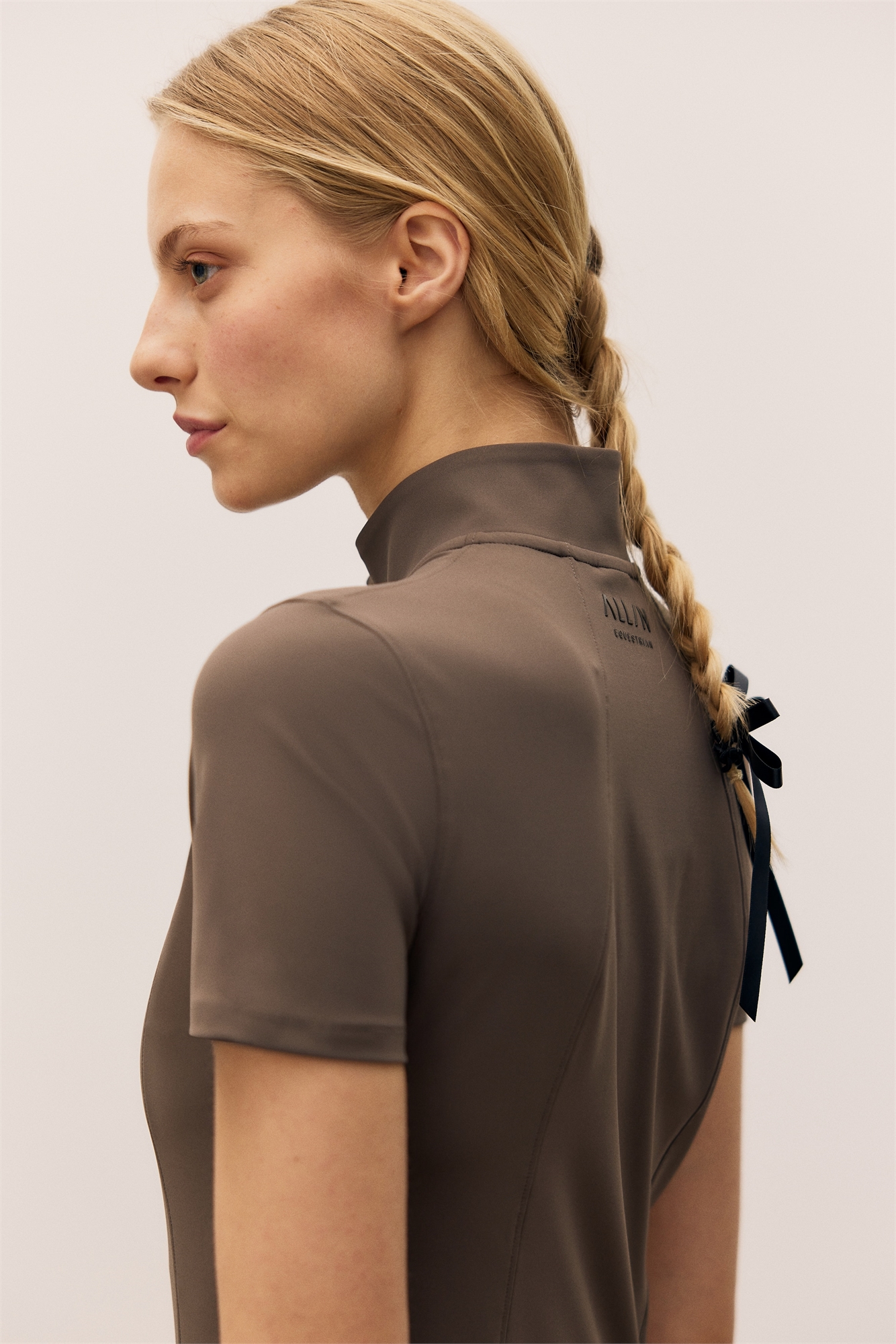 Спортивный топ с короткими рукавами из быстросохнущего и дышащего трикотажа с воротником-стойкой, застежкой-молнией в верхней части с защитой подбородка от натирания и видимыми швами спереди.