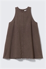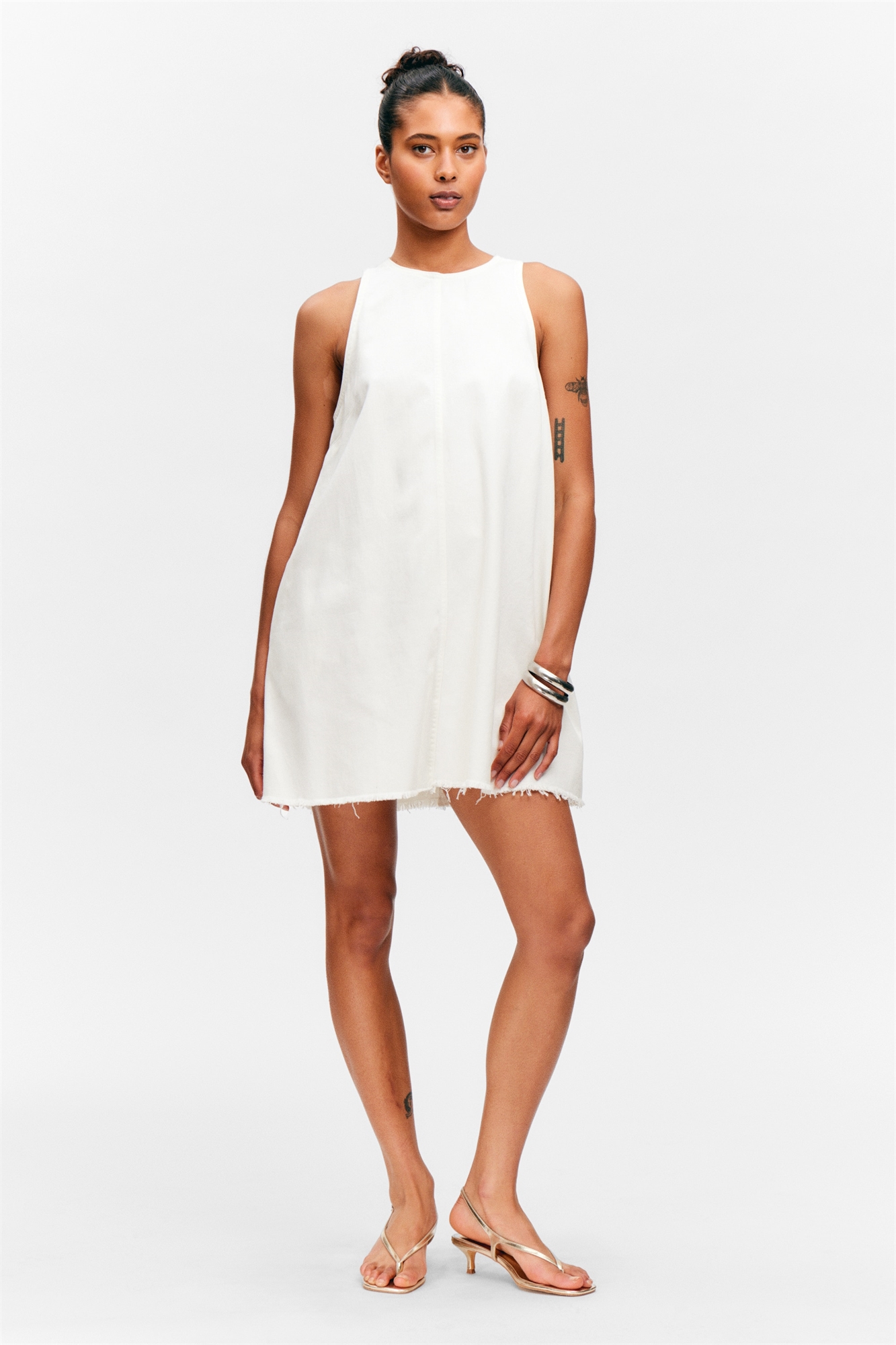 Мини-платье без рукавов свободного А-линии силуэта. Оно сшито из хлопковой саржи и имеет необработанный подол, скрытую застежку-молнию сзади и карманы в боковых швах.