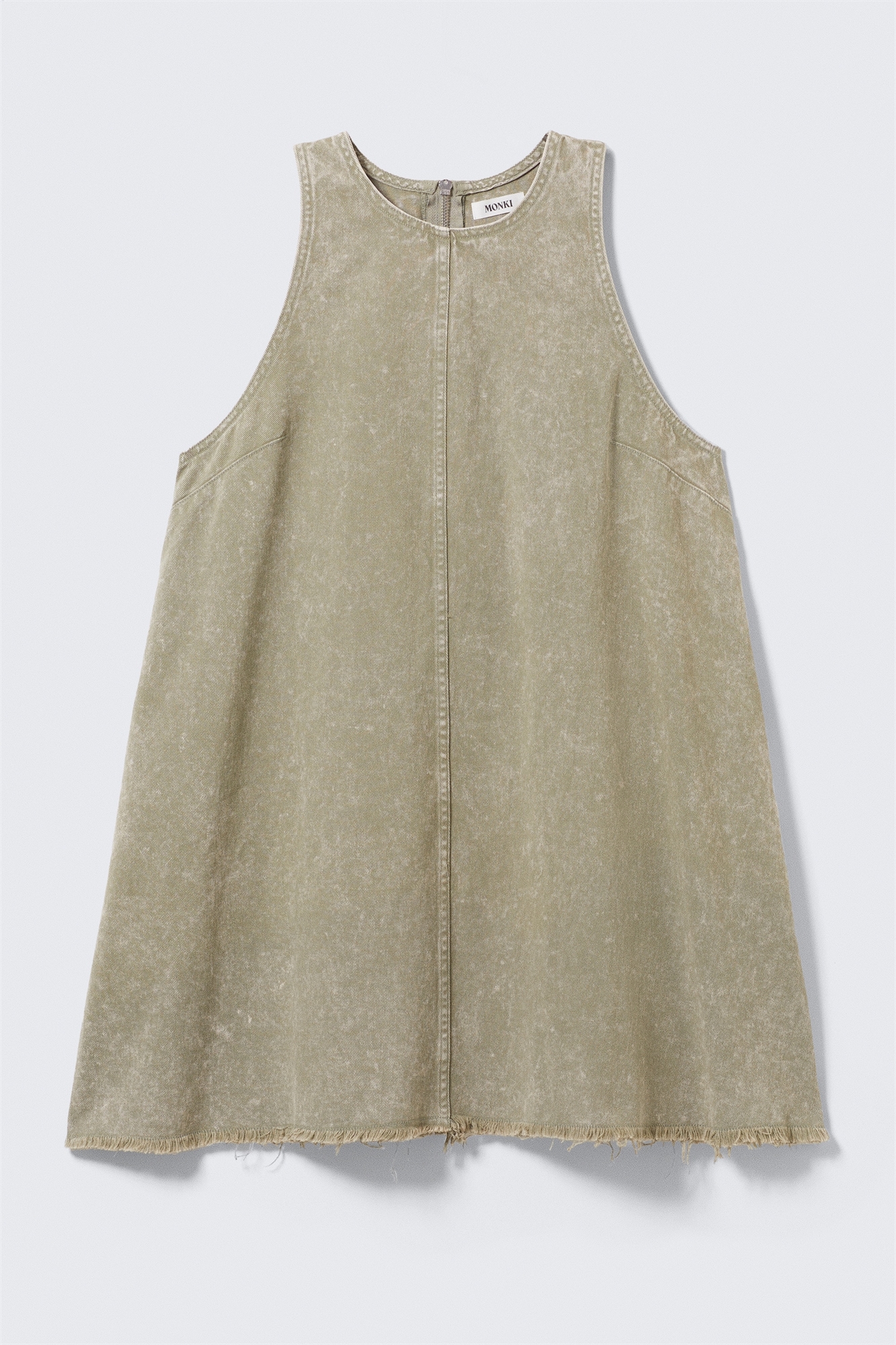Мини-платье без рукавов свободного А-линии силуэта. Оно сшито из хлопковой саржи и имеет необработанный подол, скрытую застежку-молнию сзади и карманы в боковых швах.
