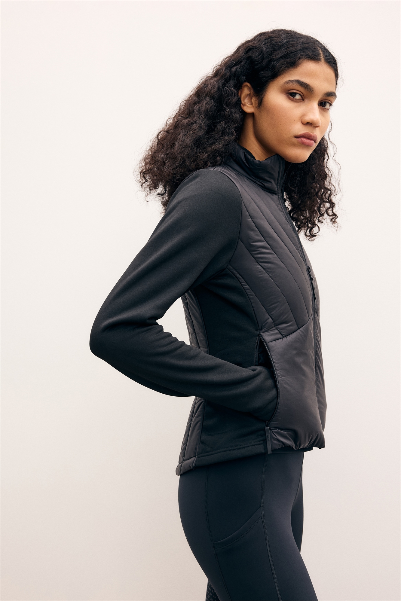 Куртка для верховой езды на подкладке, стеганая, с рукавами из прочного трикотажа. Воротник-стойка и застежка-молния спереди с защитой подбородка от натирания. Боковые карманы на молнии и удлиненные рукава с отверстиями для больших пальцев.