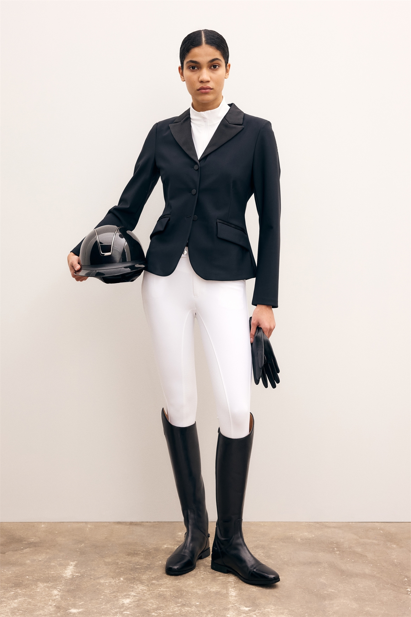 Облегающий пиджак для соревнований с атласными деталями, воротником и лацканами из контрастной ткани. Три пуговицы спереди, накладные передние карманы и двойной задний клапан. Вентиляционные отверстия с лазерной резкой на боковых панелях и рукавах. Частично на подкладке.
