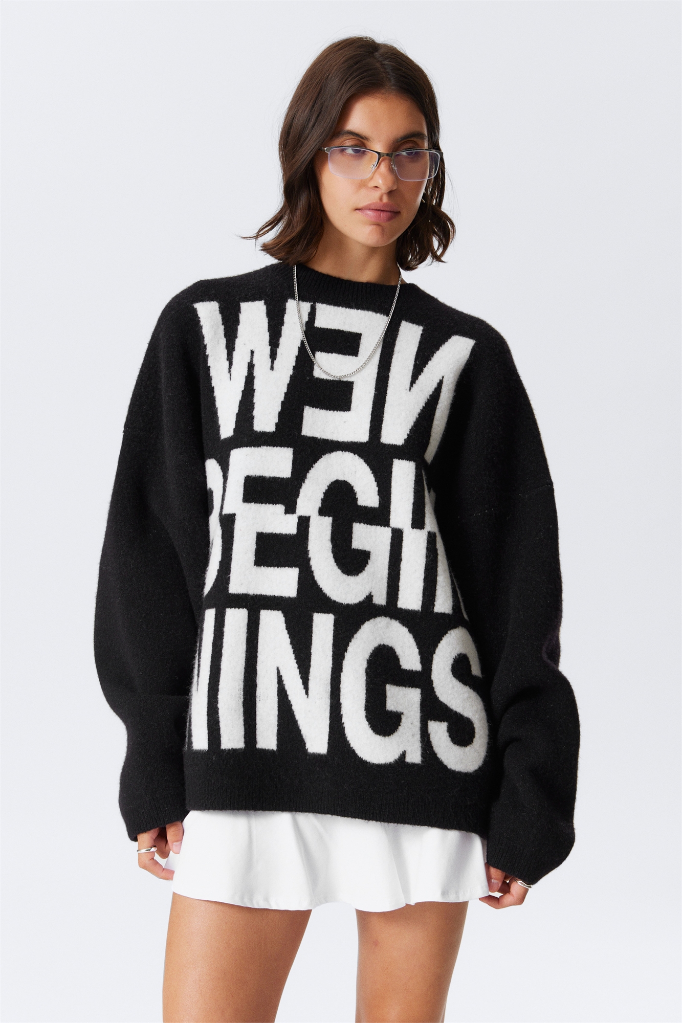 Свитер больших размеров с графической энергией, выполненный из жаккардового трикотажа "птичий глаз" с добавлением шерсти. Модель с опущенными плечами, широкой посадкой и ребристой отделкой обеспечивает мягкую и структурированную форму.