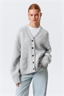 Мягкий кардиган на пуговицах с непринужденным, сутулым силуэтом. Он имеет глубокий V-образный вырез, спущенные плечи и накладные карманы с закругленными углами. Кардиган с ребристой отделкой и фактурной гладкой вязкой.