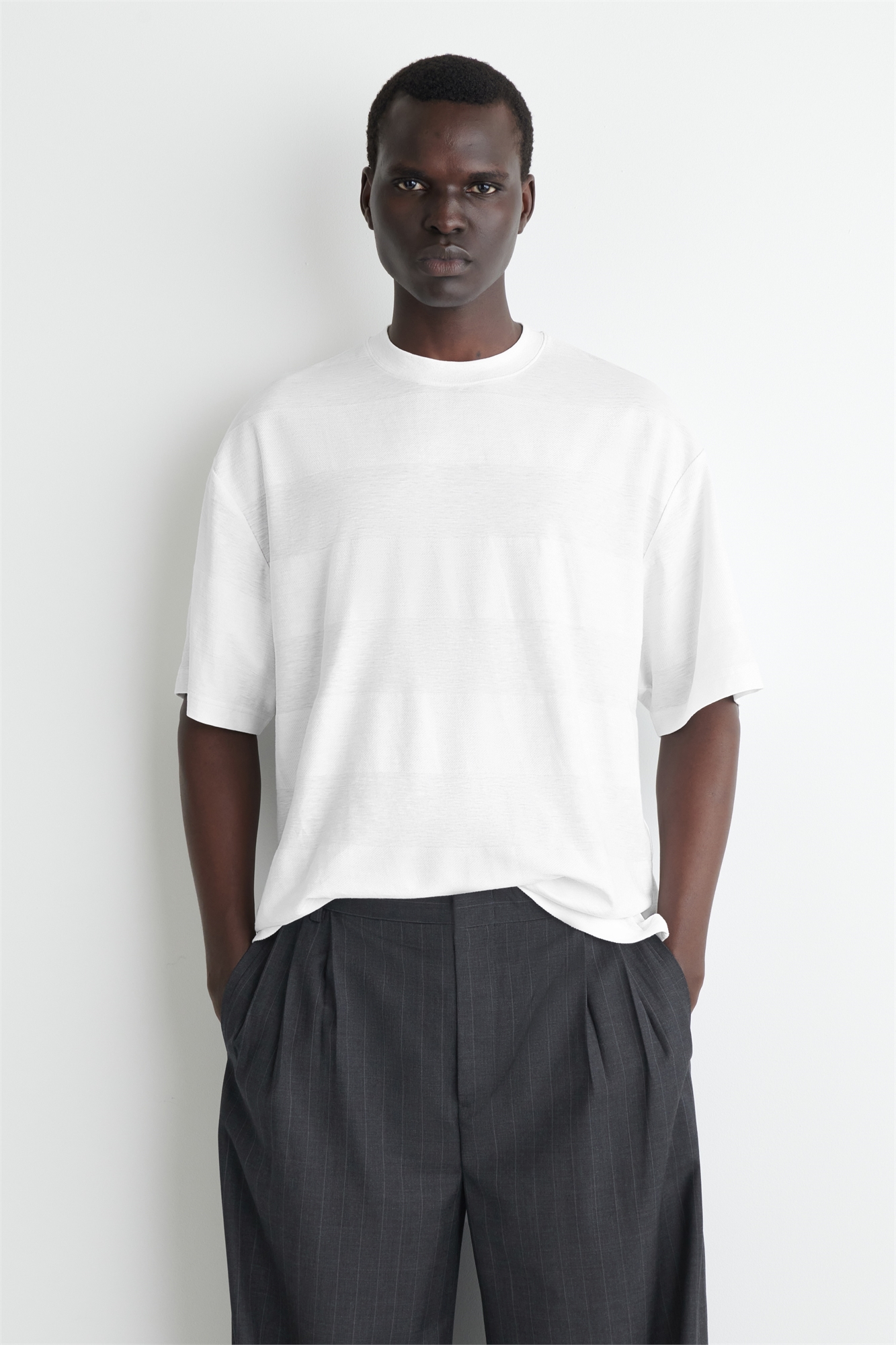 Команда мужской моды обновляет классическую футболку неожиданными деталями. Эта футболка с вырезом горловины изготовлена из мягкого хлопка с добавлением льна для воздухопроницаемости и украшена тонким узором в блочную полоску. Футболка пошита в стиле оверсайз для непринужденного образа. Oversized fit Материал: 89% хлопка, 11% льна. Подкладка для горловины: 100% хлопок. Ребро: 79% хлопка, 19% льна, 2% эластана. Без учета отделки / Машинная стирка Длина по спинке для размера M составляет 69,7 см / Модель носит размер M