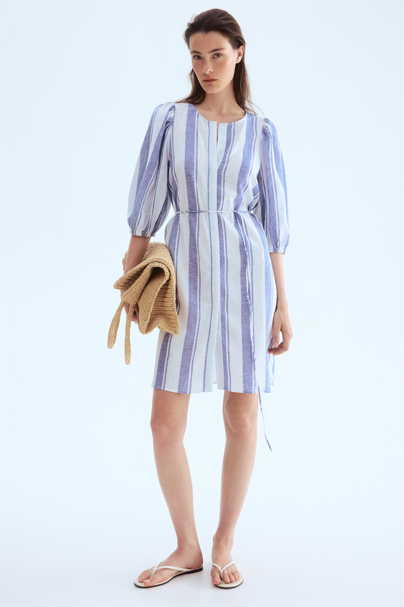 Платье длиной до колена из воздушного льняного полотна с круглым вырезом, потайными пуговицами спереди и узким съемным поясом-завязкой на талии. Рукава-баллоны длиной до локтя с узкими эластичными манжетами. Без подкладки.