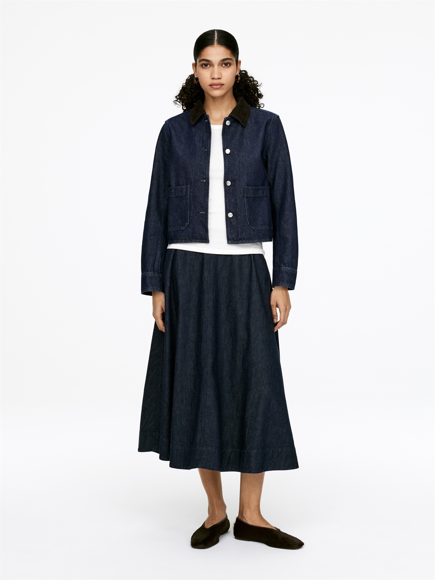 Джинсовая рубашка оверсайз с вельветовым воротником, застежкой на пуговицы и передними карманами. Обычный крой.