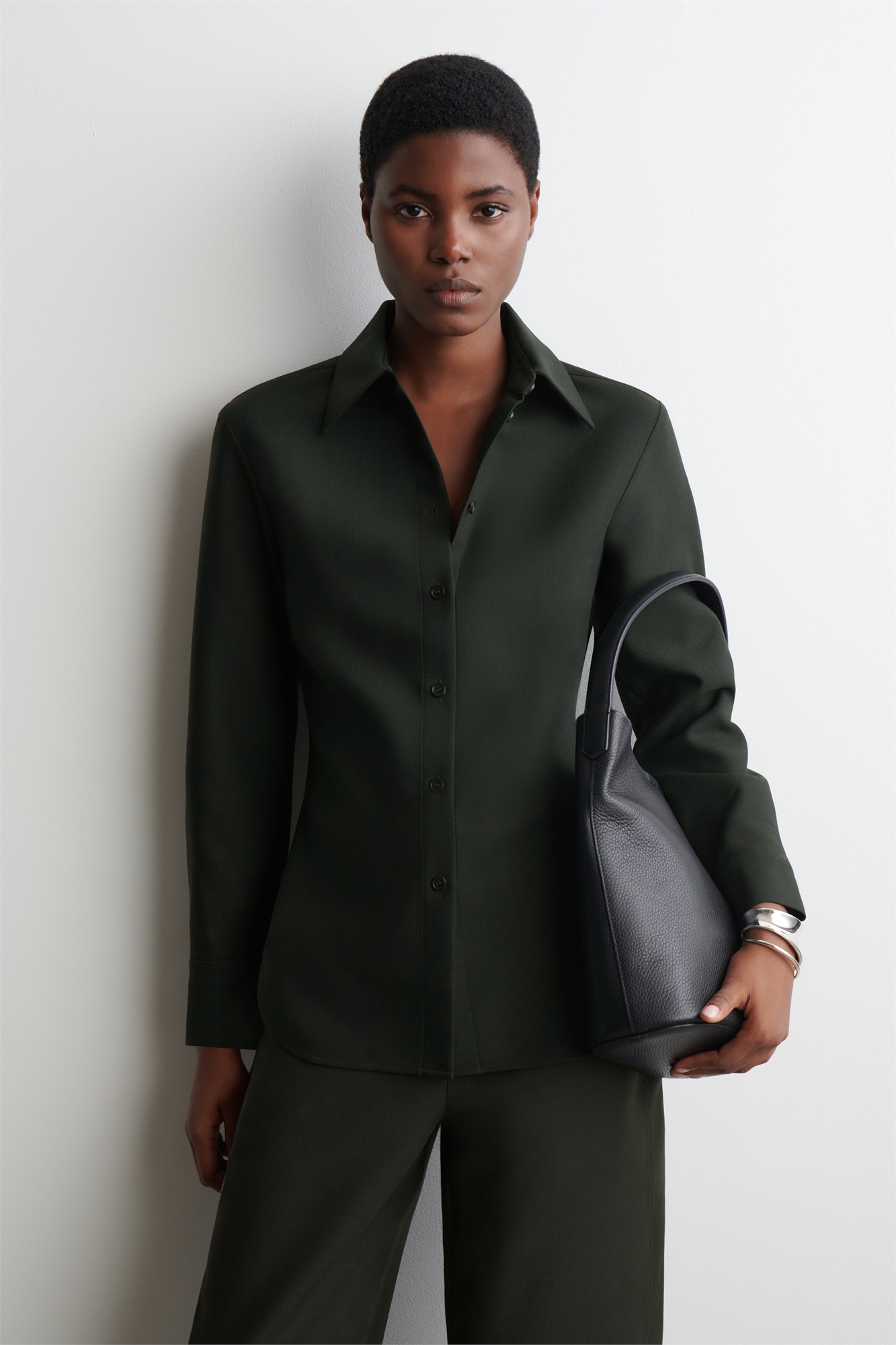 Эта рубашка из шерстяной саржи темно-зеленого оттенка имеет свободный крой и вытачки на талии для смягчения силуэта. Заостренный воротник, манжеты на пуговицах и закругленный подол отдают дань уважения классическому пошиву. Свободный кройПуговицыРабота из переработанного полиэстера - это полиэстер, изготовленный из ПЭТ-бутылок или текстильных отходов. ПЭТ-бутылки или текстильные отходы подвергаются механической переработке и перерабатываются в новую пряжу Верхний материал: 53 % переработанного полиэстера, 43 % шерсти RWS, 4 % эластана. Подкладка: 100 % хлопок. Детали исключены/Сухая чистка Длина по спинке в размере 36 = 68,3 см/Модель носит размер 36