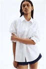 Рубашка оверсайз из хлопкового полотна с воротником, застежкой на пуговицы спереди, передом и перевернутой складкой сзади. Спущенные плечи, длинные рукава с манжетами на пуговицах и рукавной планкой с пуговицей. Накладной нагрудный карман и подол прямого кроя с закругленными боковыми вентиляционными отверстиями.