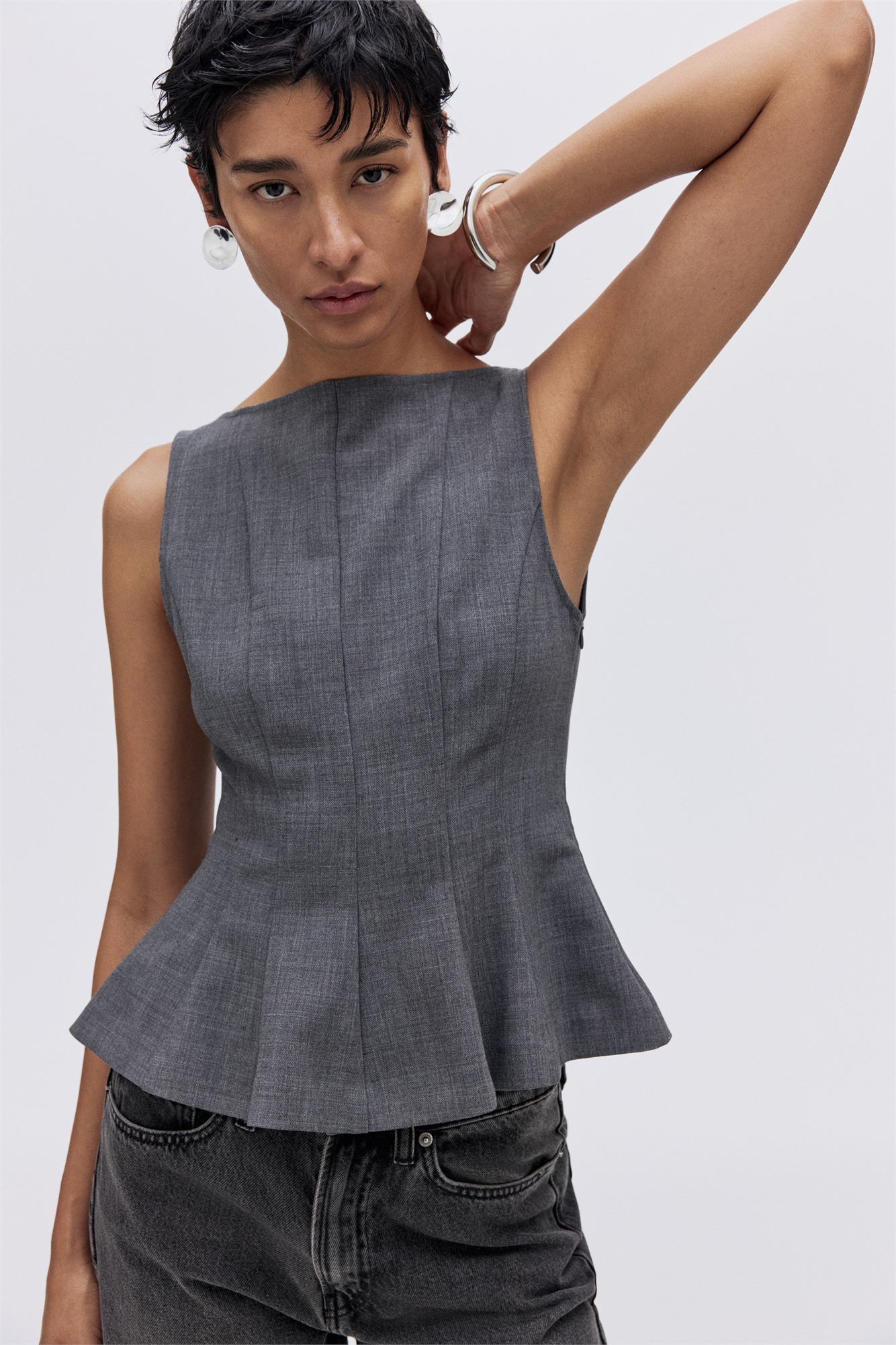 Облегающий топ без рукавов из тканого материала с вырезом-лодочкой, видимыми швами спереди и сзади, потайной застежкой-молнией с одной стороны и расклешенным пеплумом.
