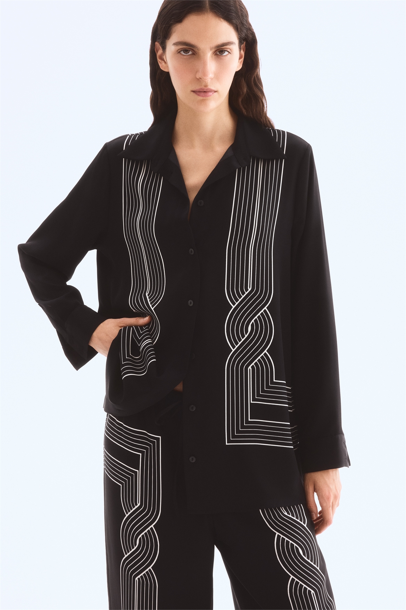 Рубашка оверсайз из набивной саржи с воротником, пуговицами спереди, слегка спущенными плечами и длинными рукавами с манжетами на пуговицах. Подол прямого кроя.