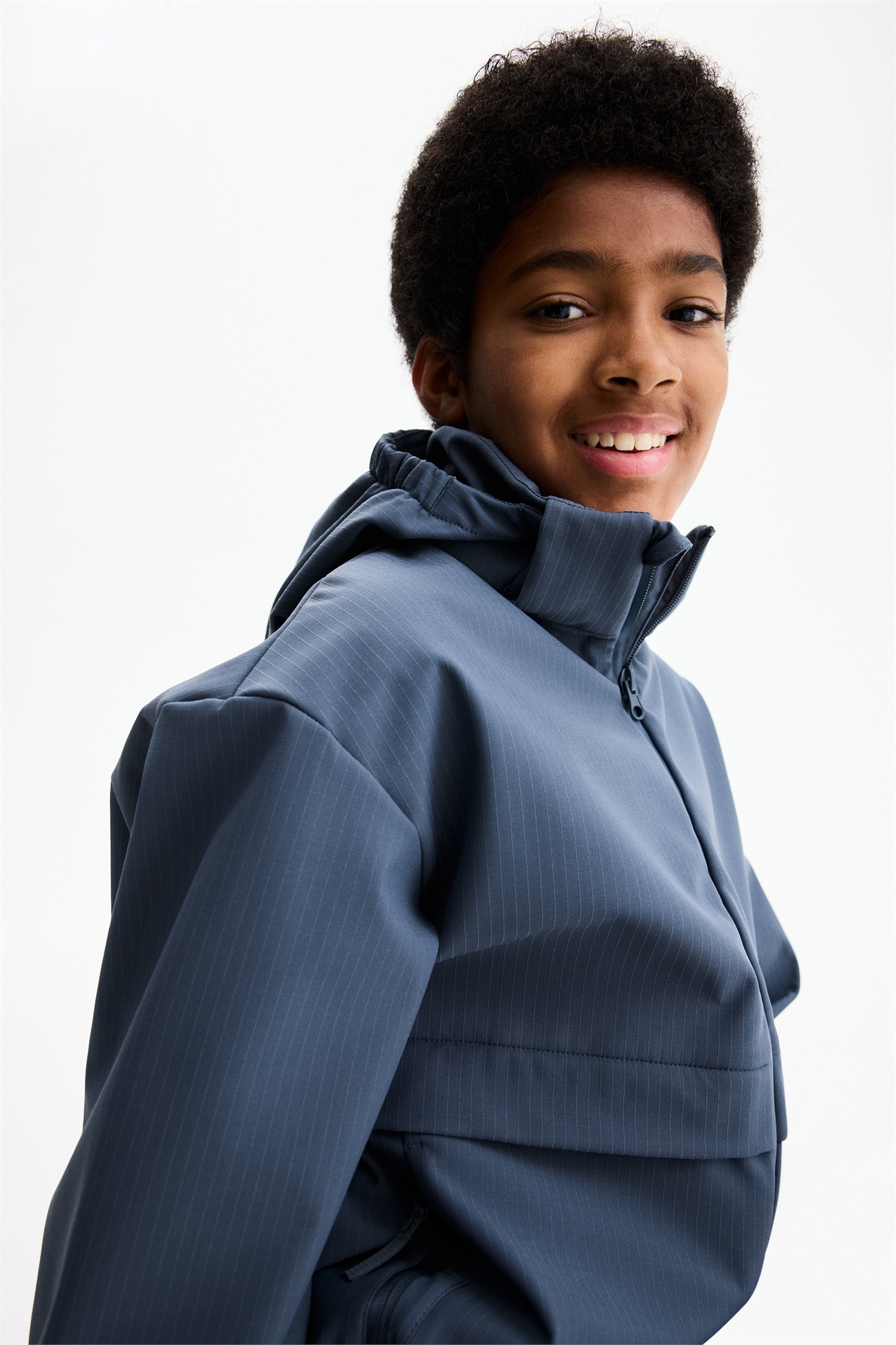 Легкая куртка Softshell из ветрозащитной, водоотталкивающей функциональной ткани. Съемный капюшон на флисовой подкладке с регулируемым крючком и петлей сзади, чтобы он не спадал и плотно прилегал к голове. Свободный крой с воротником-стойкой, застежкой-молнией спереди и защитой подбородка от натирания, передними карманами на молнии и открытым ярмом сзади с сеткой для вентиляции. Длинные рукава с эластичными манжетами. Аккуратный закругленный подол со скрытым эластичным шнурком. Без подкладки.