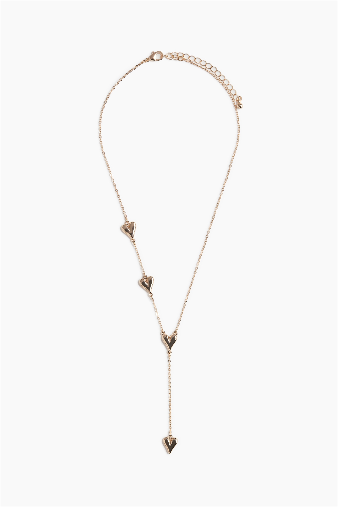 Y-образное металлическое ожерелье с маленькими подвесками в форме сердца. Регулируемая длина с застежкой-триггером.