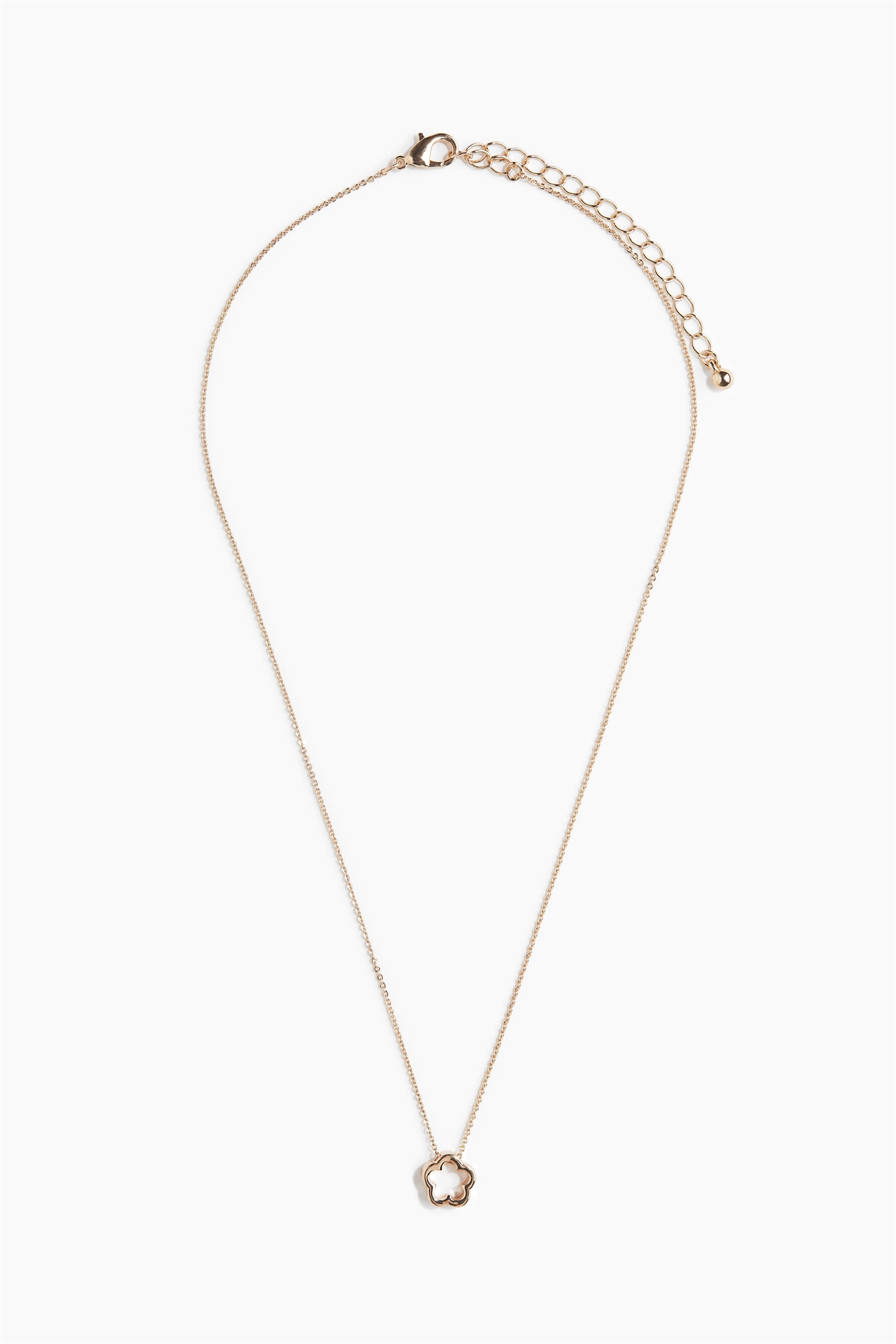 Ожерелье на металлической цепочке с маленькой подвеской в форме цветка. Регулируемая длина с застежкой-триггером.