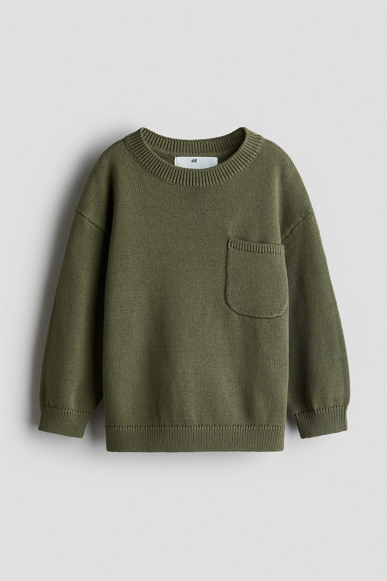 Джемпер из мягкого хлопка тонкой вязки с накладным нагрудным карманом. Круглый вырез в рубчик, спущенные плечи, длинные рукава, манжеты и подол в рубчик.
