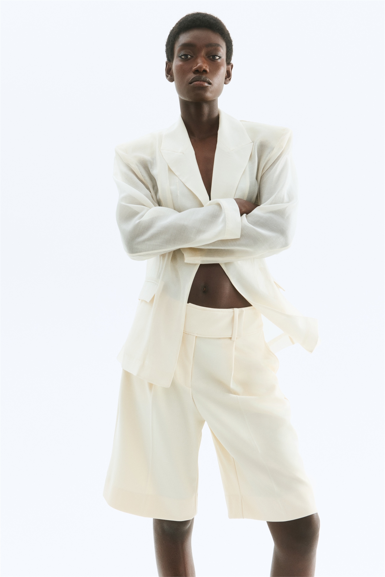 Шорты из джерси с высокой талией, ширинкой на молнии и удлиненным поясом с застежками-крючками. Небрежные боковые карманы, складки спереди и складки спереди и сзади.