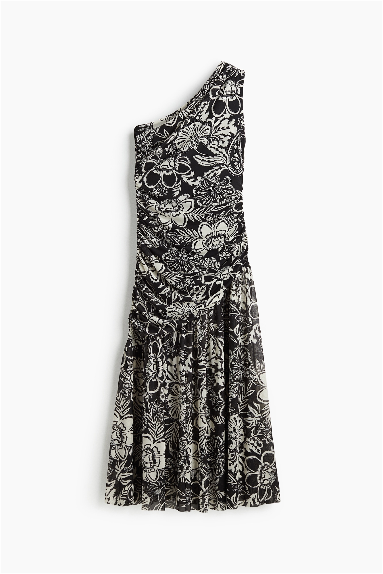 Приталенное платье длиной до щиколоток из крепового джерси с асимметричным вырезом и одной широкой бретелью. Сборки на плече и с одной стороны для создания эффекта драпировки. Диагональный шов на юбке для придания объема. Необработанный подол. Частично на подкладке.