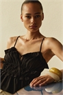 Короткий топ из тканого материала, украшенный сборками и оборками. Регулируемые бретели-спагетти и V-образный вырез с узким шнурком спереди.