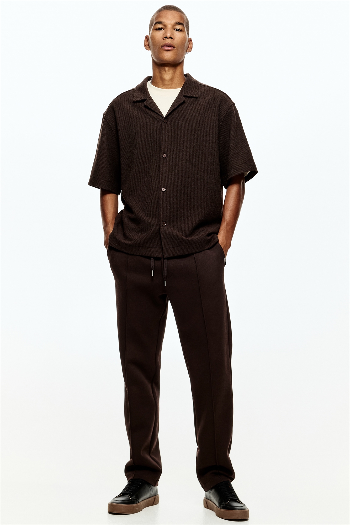 Джоггеры из средней плотности джерси из смеси хлопка с застроченными складками спереди. Эластичный пояс с завязками, фальшивая ширинка, боковые карманы и накладной задний карман. Регулярный крой для комфортной носки и классический силуэт.