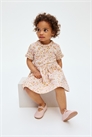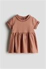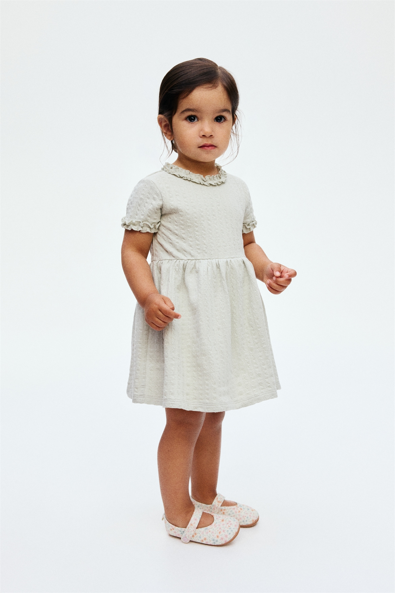 Платье с короткими рукавами из мягкого жаккардового джерси из хлопка с декоративной отделкой в виде оборок. Круглый вырез, отверстие для ключа с пуговицей сзади, сборки на талии и расклешенная юбка.