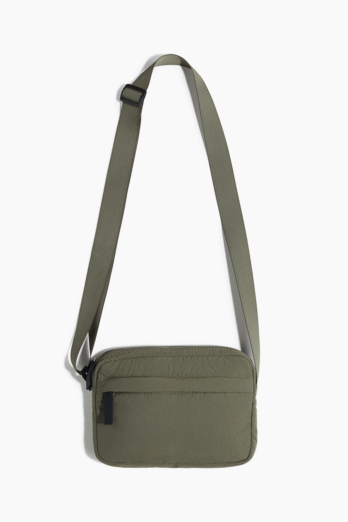 Сумка-кроссбоди из нейлона с застежкой-молнией в верхней части и регулируемым плечевым ремнем с металлической пряжкой. Внешнее отделение на молнии и два открытых внутренних отделения. На подкладке.