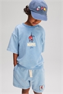 Принтованный комплект из футболки и шорт из мягкой, легкой ткани. Футболка с круглым вырезом с ребристой отделкой, спущенными плечами и окантовкой по подолу. Шорты с эластичной утягивающейся талией и незаметными боковыми карманами.