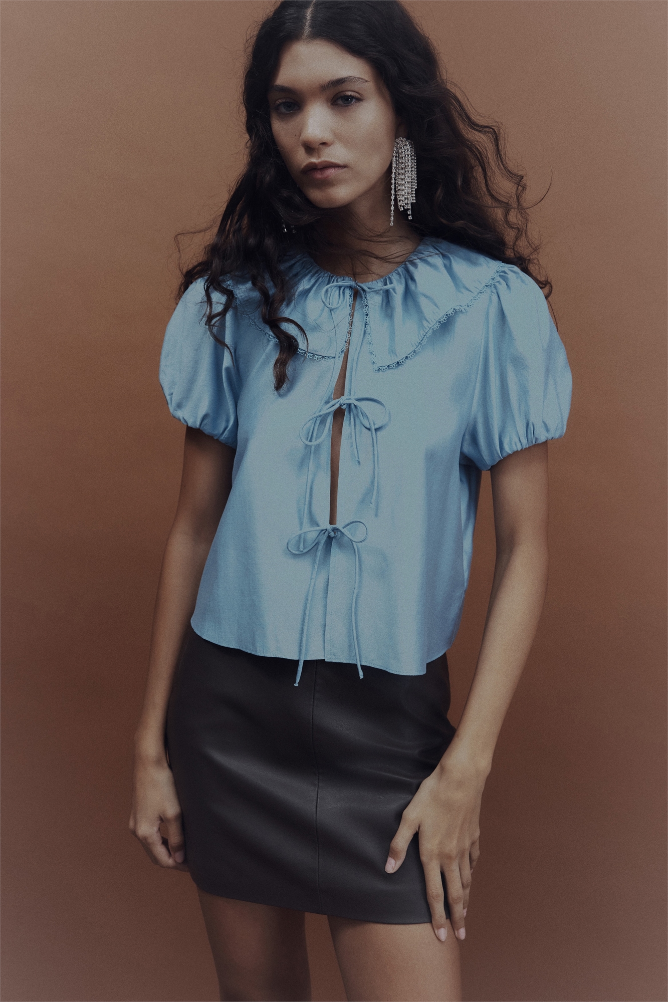 Блузка из вискозного полотна с легким блеском. Воротник "Питер Пэн" с нежной кружевной отделкой и открытой передней частью с тремя парами узких завязок. Короткие пышные рукава с эластичной отделкой на манжетах.