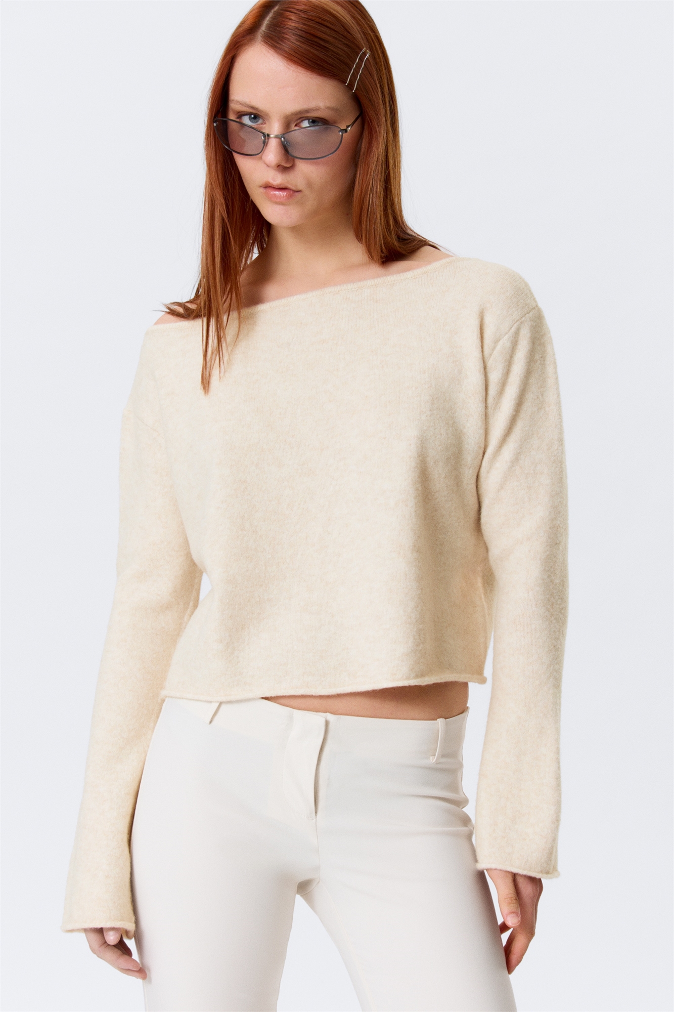 Мягкий вязаный свитер с широким вырезом-лодочкой и непринужденным силуэтом. Вязаный из матовой пряжи с добавлением шерсти, он имеет закатанные края на подоле и манжетах для создания незавершенного вида. Отделка в рубчик по вырезу горловины и спущенные плечи придают образу непринужденность.