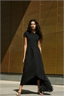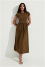 Платье макси с приталенным лифом из плотного трикотажа интерлок с круглым вырезом и короткими рукавами. Присборенный шов на талии и объемная юбка из воздушного хлопкового полотна. Без подкладки.