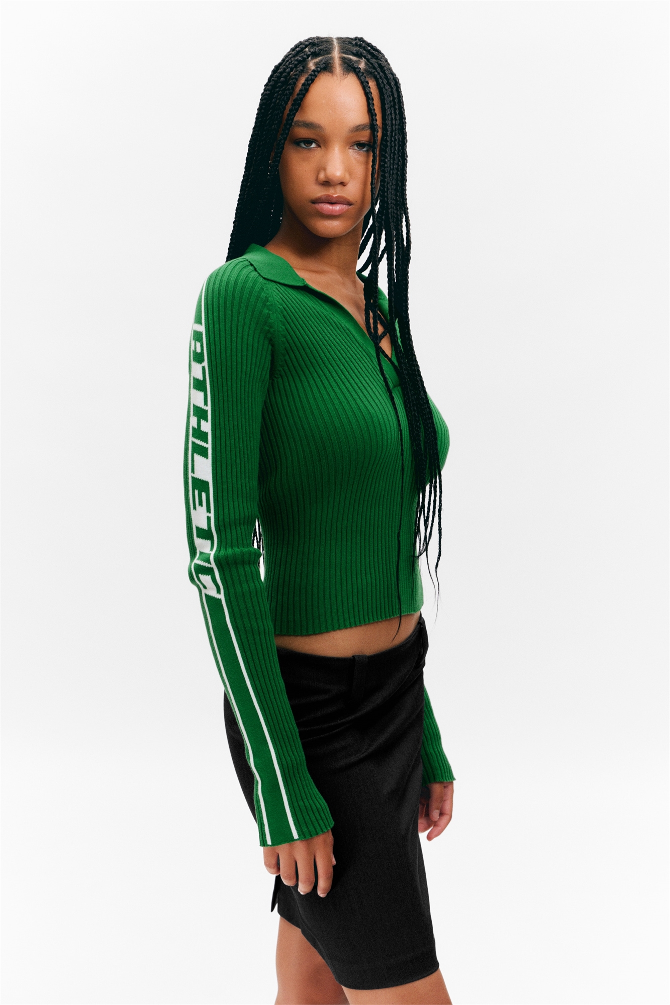 Топ с длинными рукавами, облегающий силуэт и мягкая ребристая текстура. Вязаный из мягкой хлопковой пряжи, он имеет плоский воротник с глубоким V-образным вырезом для четкого структурированного вида и рукава реглан.