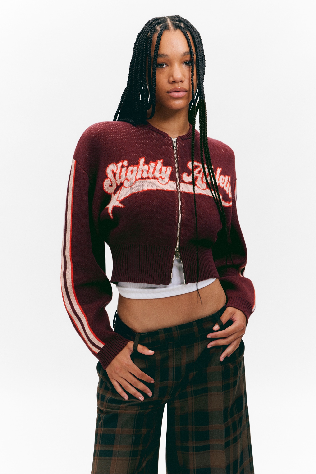 Обрезанный кардиган на молнии из мягкой хлопковой пряжи жаккардовой вязки создан в стиле varsity и имеет четкий, скульптурный силуэт. Застежка-молния с двух сторон, ребристая отделка и завышенная посадка выше талии.