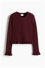 Короткий приталенный кардиган из мягкого трикотажа в рубчик с круглым вырезом и пуговицами спереди. Длинные рукава, манжеты и подол с окантовкой.