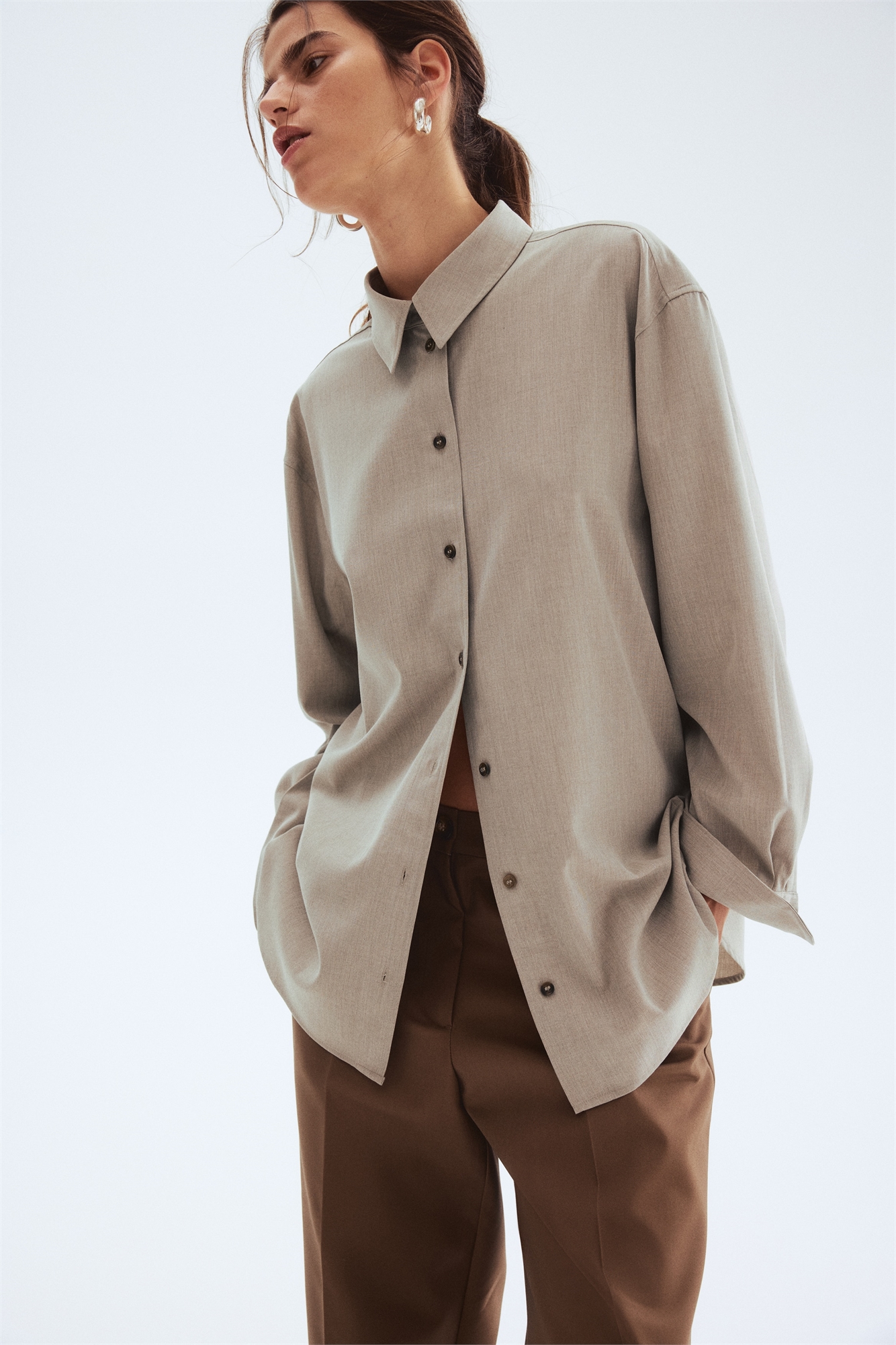 Рубашка оверсайз из мягкой ткани с воротником и пуговицами спереди. Иг на спине, слегка опущенные плечи и длинные рукава с манжетами на пуговицах и рукавной планкой с пуговицей. Подол прямого покроя с фигурными боковыми вентиляционными отверстиями.
