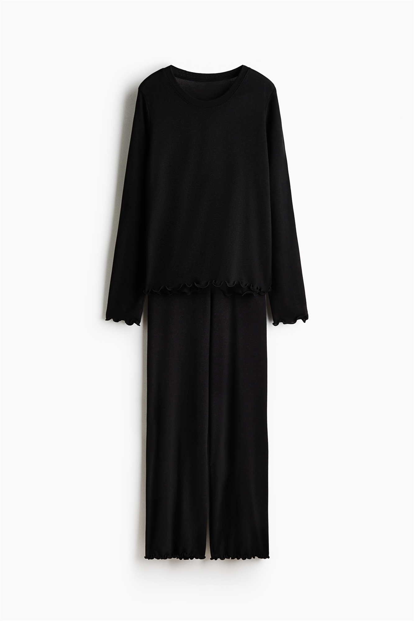 Пижама с верхом и низом из мягкого матового трикотажа, изготовленного из смеси вискозы. Верхняя часть имеет круглый вырез, длинные рукава, манжеты и подол обработаны оверлоком. Нижние штанишки с эластичной талией и прямыми ножками с оверлоком по подолу.