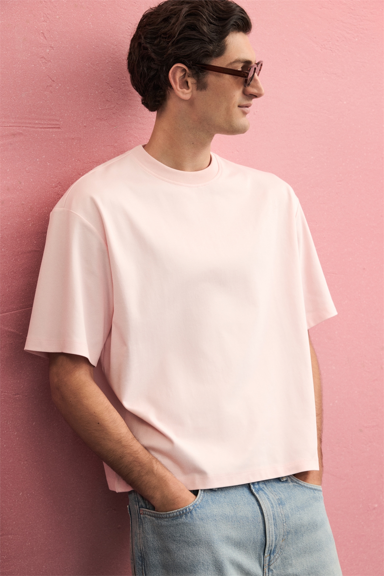 Футболка в стиле бокс из плотного хлопкового джерси с круглым вырезом в рубчик, спущенными плечами и прямым покроем. Свободный крой для пышного, но не чрезмерно объемного силуэта.
