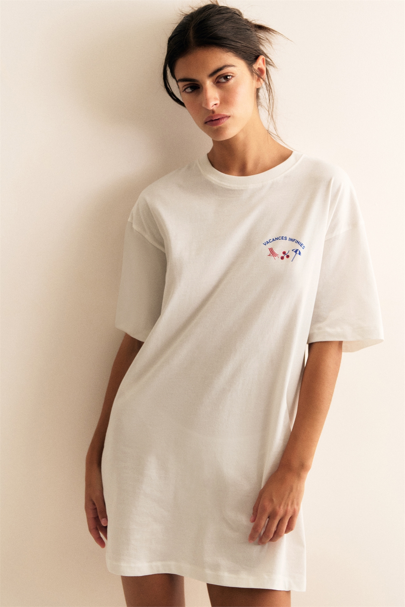 Короткая ночная рубашка из мягкого хлопкового джерси с принтом на груди. Свободный крой с ребристой горловиной, спущенными плечами и рукавами длиной до локтя.