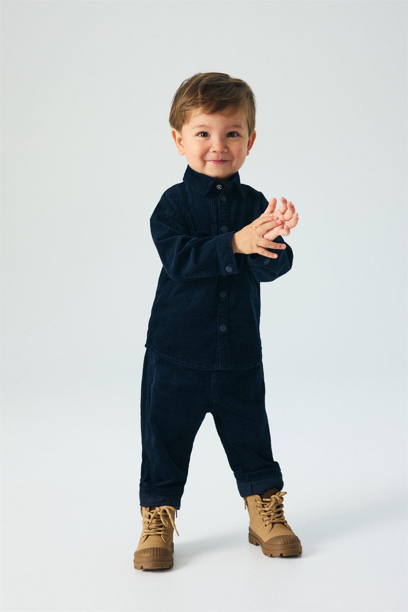 Брюки из мягкого хлопкового вельвета. Свободный крой по бедрам и ляжкам, слегка зауженные ноги. Эластичный пояс с завязками, фальшивая ширинка, декоративные боковые карманы и открытые задние карманы.