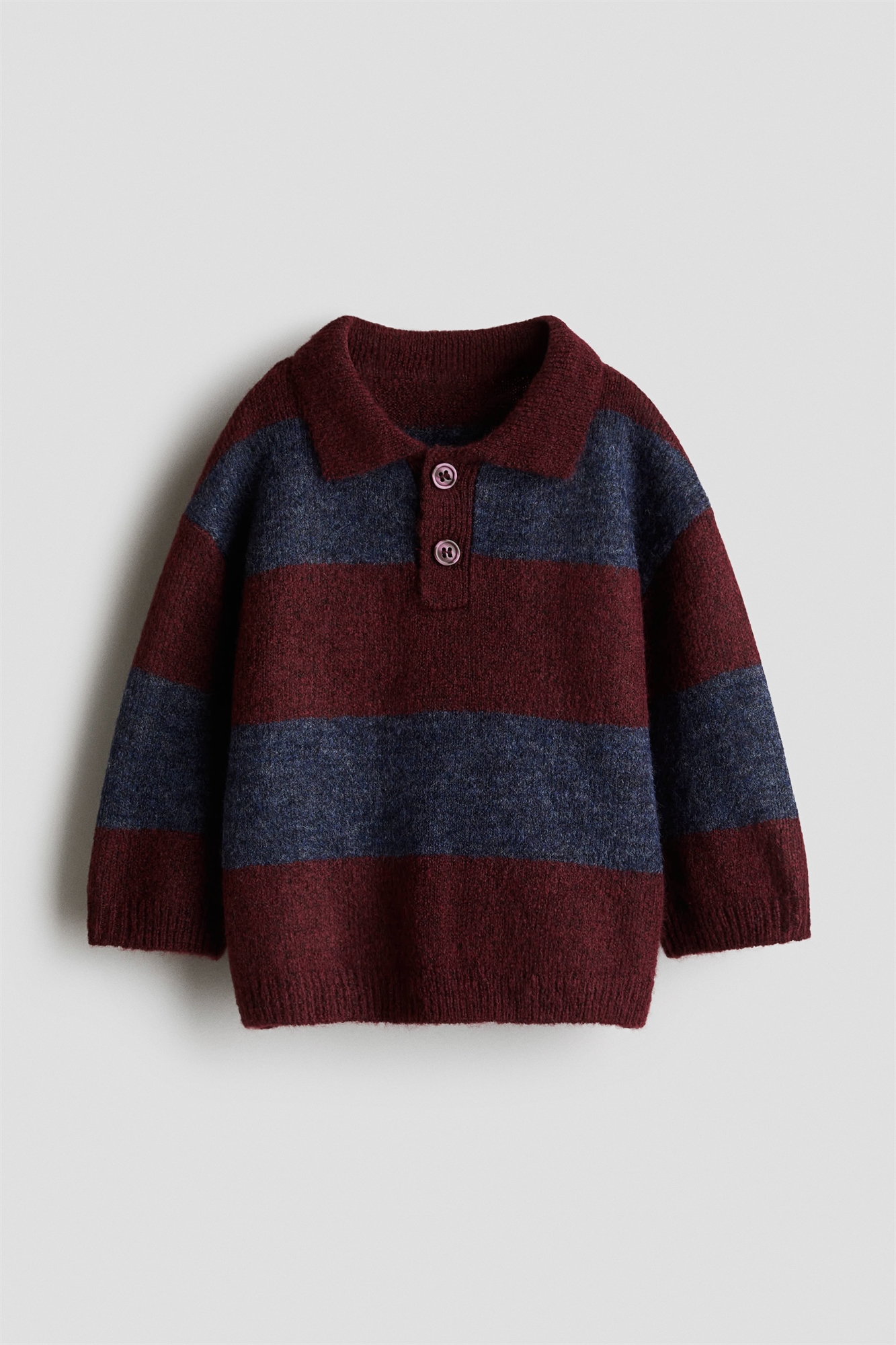 Джемпер-поло из мягкого трикотажа с отложным воротником в рубчик и застежкой на пуговицы. Спущенные плечи, манжеты и подол в рубчик.