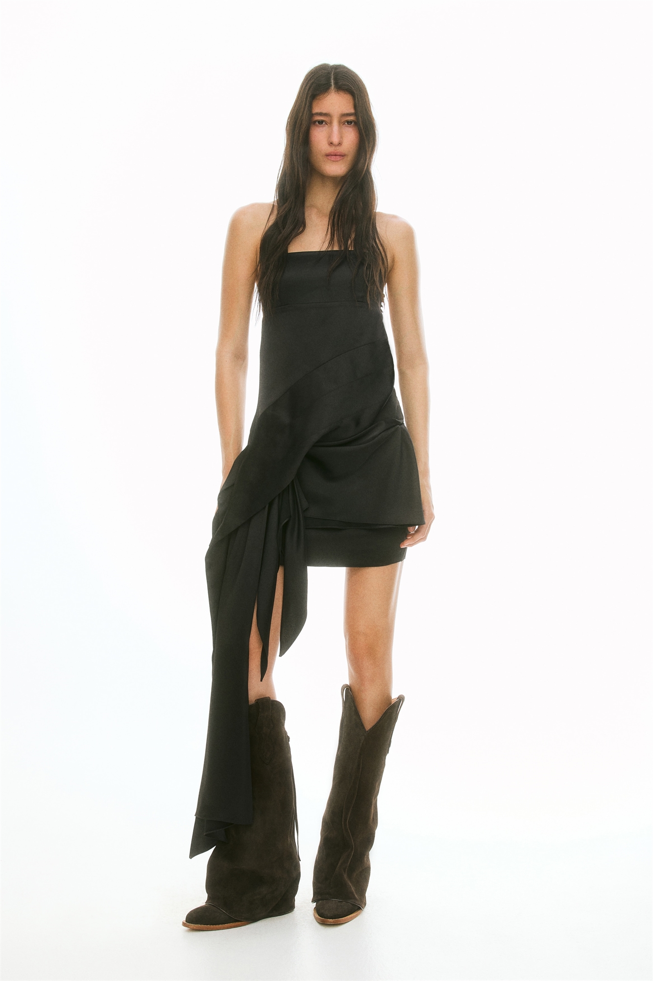 Многослойная юбка мини из блестящего атласа с облегающим силуэтом и вшитой панелью в пол с одной стороны для эффекта драпировки. Скрытая застежка-молния и застежка-крючок сзади. Без подкладки.
