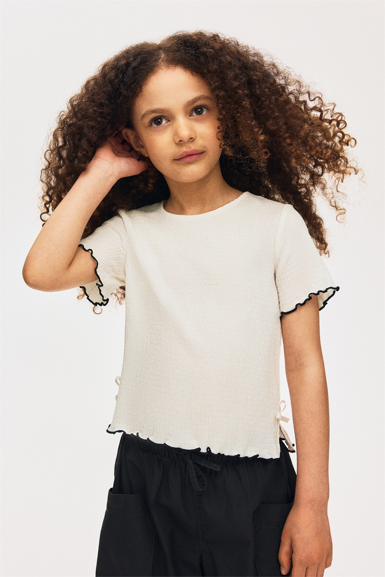 Топ с короткими рукавами из мятого трикотажа с контрастными цветными краями. Круглый вырез и небольшой разрез с декоративным бантом с каждой стороны подола.