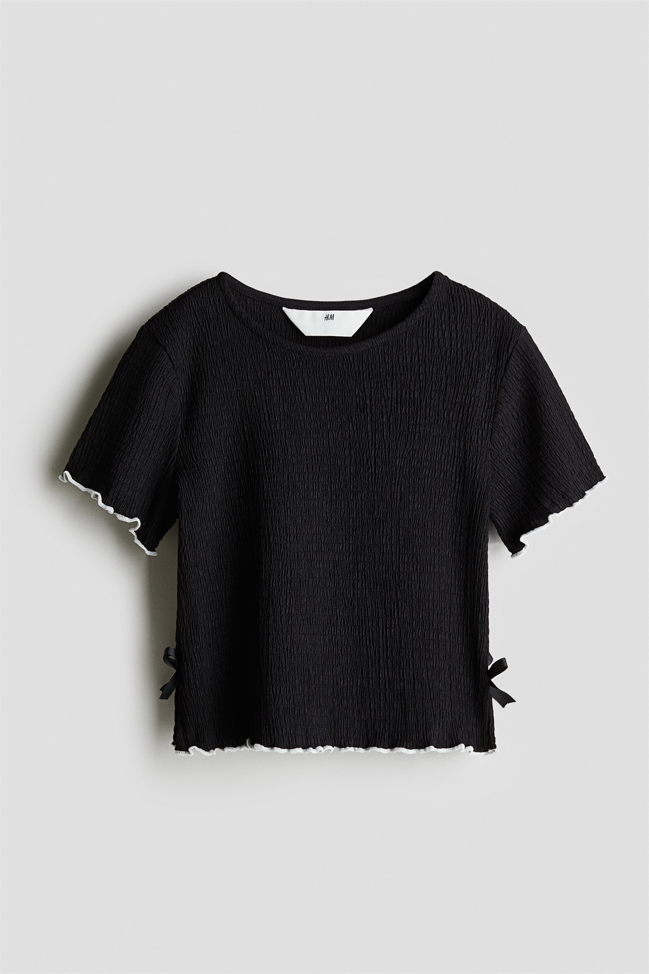 Топ с короткими рукавами из мятого трикотажа с контрастными цветными краями. Круглый вырез и небольшой разрез с декоративным бантом с каждой стороны подола.