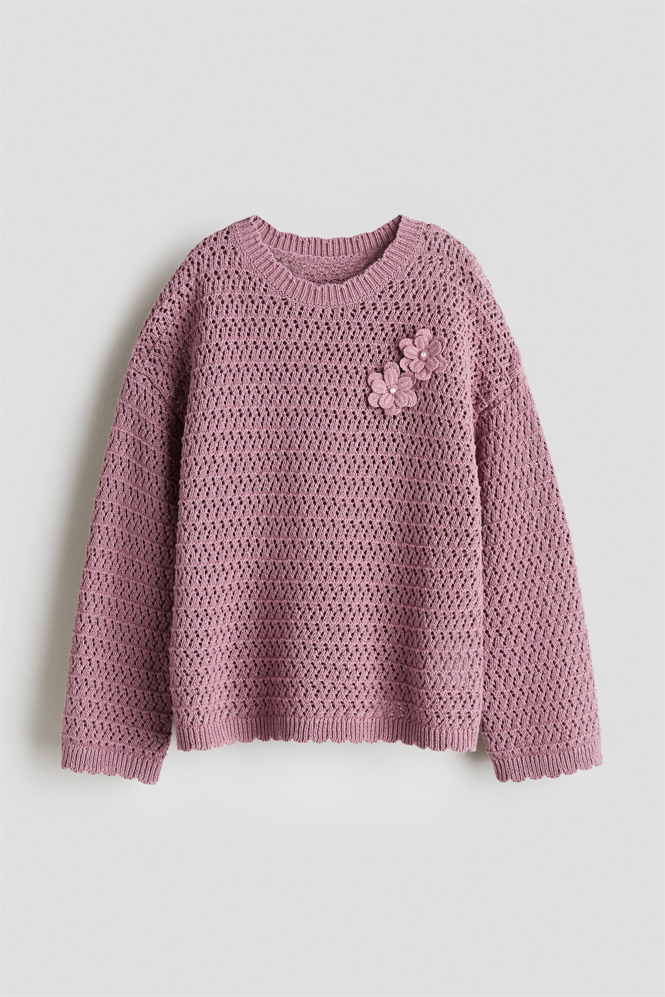 Джемпер из мягкого хлопка с дырчатой вязкой и ребристыми краями. Круглый вырез, спущенные плечи и украшенные аппликации спереди.