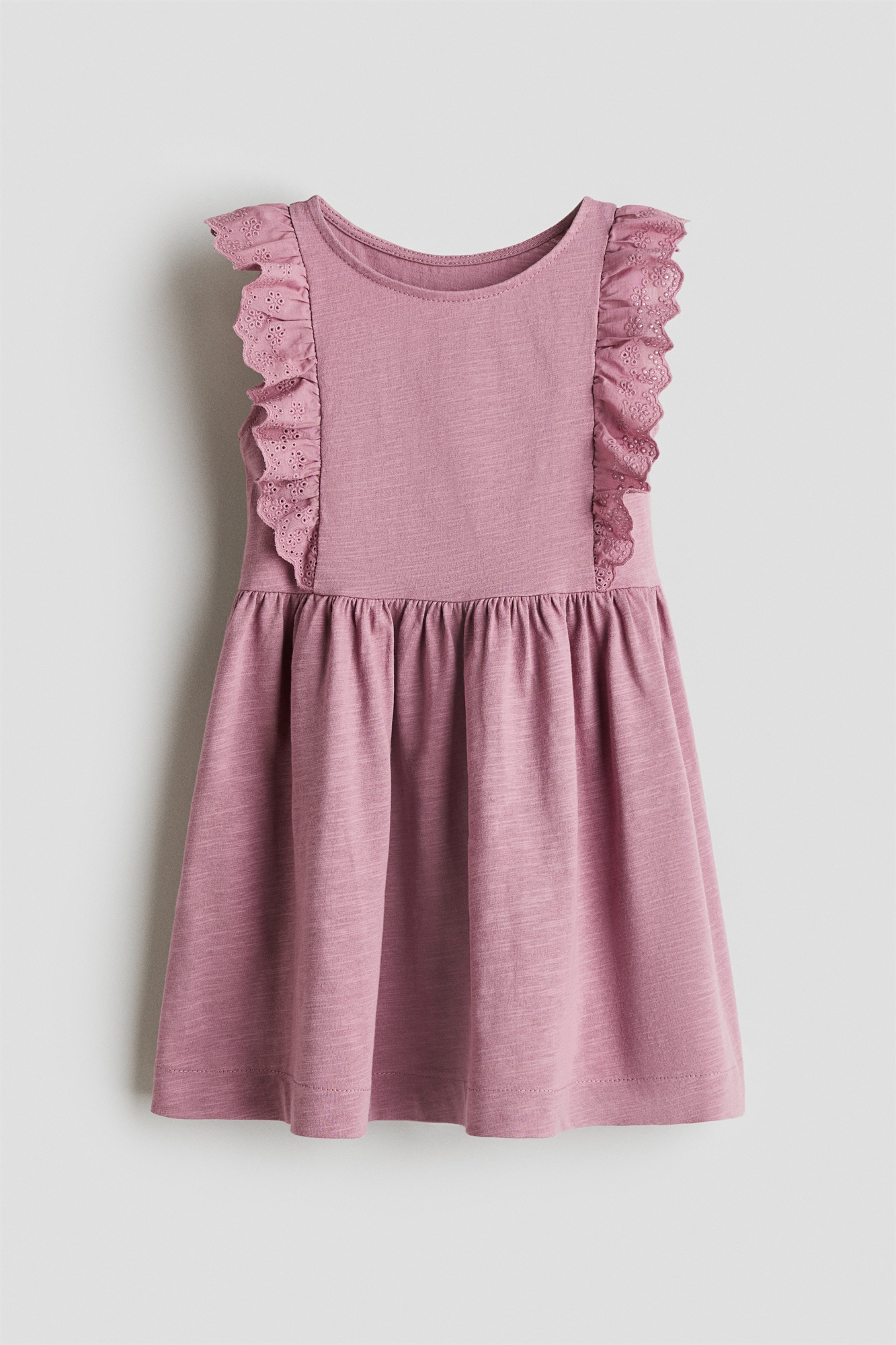 Платье без рукавов из мягкого хлопкового джерси с отделкой оборками из хлопкового переплетения с бродери-англиз. Круглый вырез и сборчатый шов на талии для придания объема.