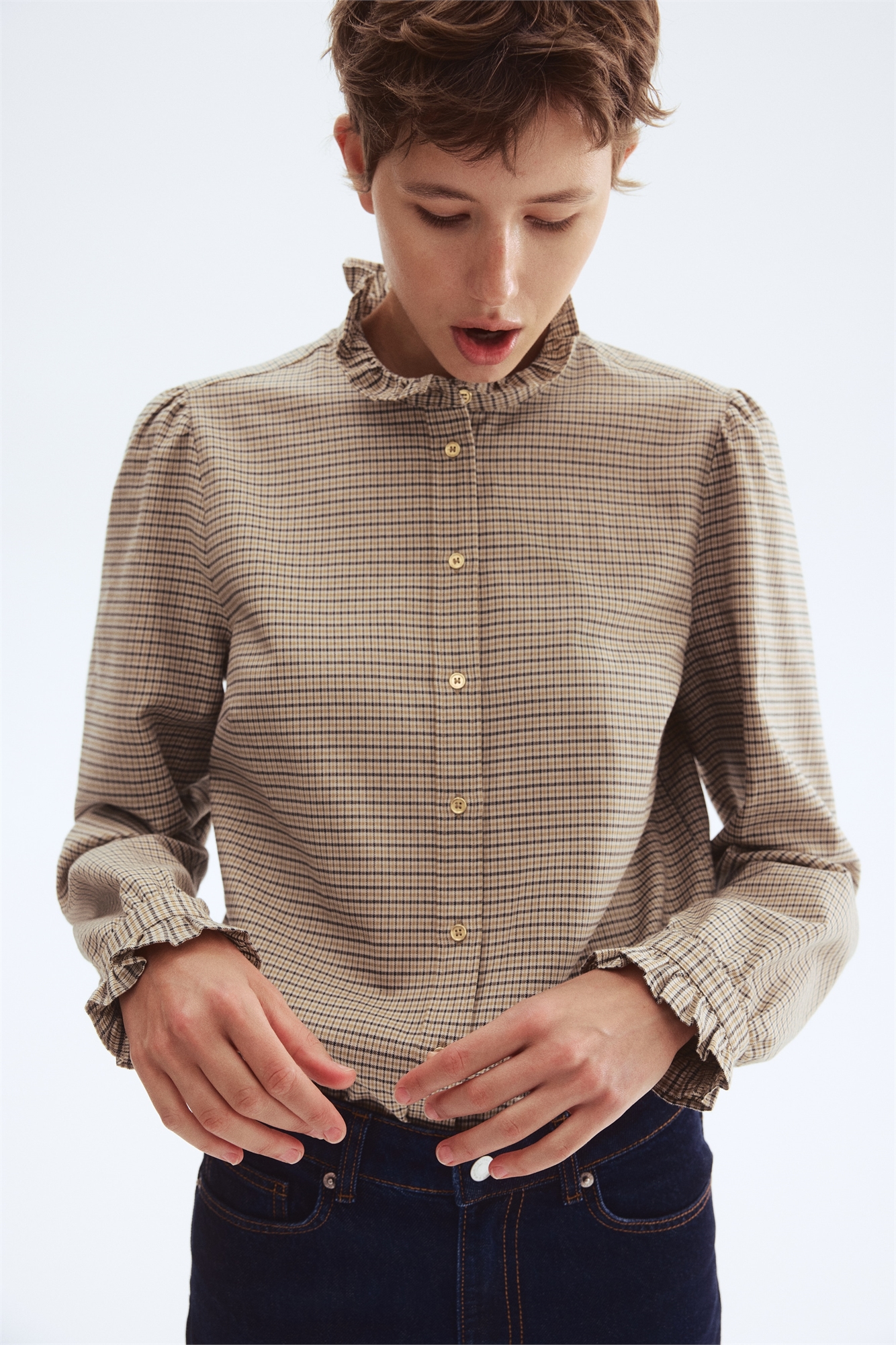 Блузка из хлопкового полотна с жатым воротником и пуговицами спереди. Нагрудные вытачки, формирующие швы сзади на талии и длинные рукава-баллон с оборчатыми манжетами на пуговицах. Аккуратный закругленный подол.