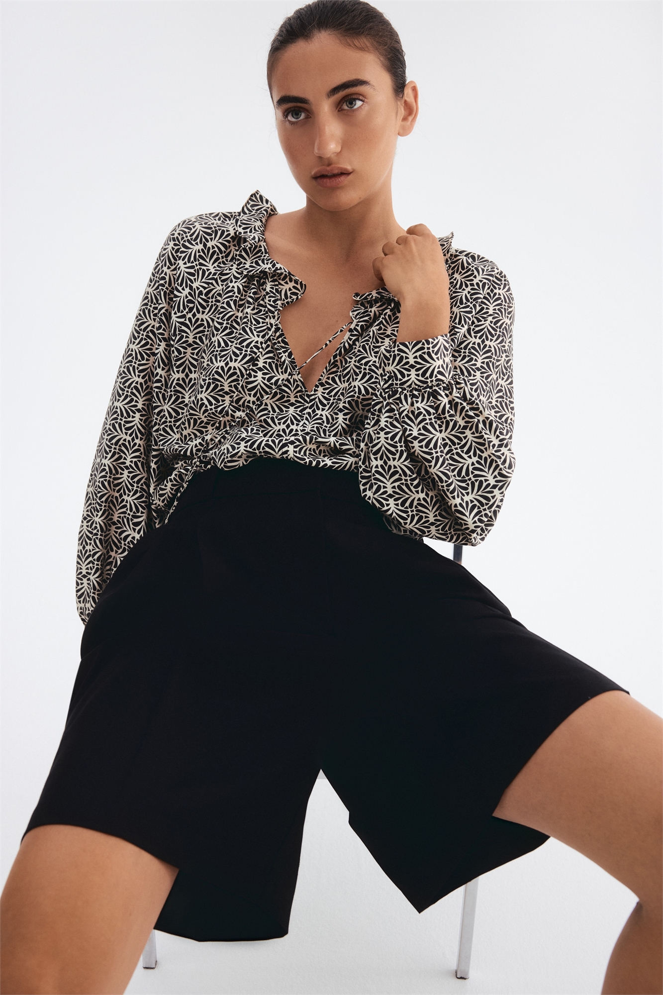 Блузка оверсайз из тканого материала с жабообразным воротником и V-образной проймой с завязками-спагетти спереди. Длинные рукава реглан с разрезом и застежкой на пуговицу на манжетах.